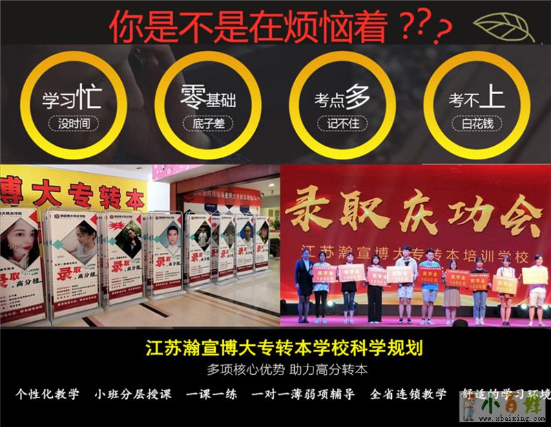 江苏瀚宣博大专转本五年一贯制专转本培训学校,是江苏唯一一家也是规模zui大的一家连锁专转本培训机构。江苏多个城市同步教学,帮助更多五年制专转本考生顺利转本。瀚宣博大专转本辅导学校提供学员更简单的学习方法,专业的咨询、院校介绍、英语辅导、考纲提供、专业课教学、统一报名、志愿填报、集体送考等一系列流程化服务,让考生更加深入了解五年制专转本(五年一贯制专转本),面对五年制专转本学习更有方向性和针对性小+百+姓+网。江苏各城市学生均可咨询就近选择上课点,不拼不博一生白活,不苦不累转本无味。既然选择风雨,那就一定要坚持到底!多轮学习,江苏五年制专转本开课时间均为周末,暑假、寒假和考前集训全天性系统学习。一次报名,循环上课至考试前。暑假班已经限额报名中,更多五年制专转本请咨询潘老师。