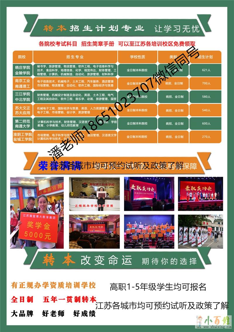 江苏瀚宣博大专转本是江苏省唯1一家专业化、规模化、系统化、连锁化、小班化主做五年制专转本(五年一贯制专转本)培训辅导学校,发展于2008年,历年来帮助数名考生成功转本,圆本科梦!小班化的学习形式,既能提供良好的课堂气氛,又能给学生更多的学习交流机会,同时老师也有足够的精力指导每一位学生,更加注重考生听课效率,更加有效的管理学员,提高成绩,提升考试通过率;全日制上课模式,高考式复习管理,让考生深刻感受到五年制专转本—全日制本科学.历的重要性,珍惜zui后一次提升学.历的机会;严格的上下课打卡制度,一天要打四次卡,提高学员上课的积极性和主动性小+百+姓+网。江苏瀚宣博大五年制专转本培训辅导学校拥有强大的师资阵容,详细精准的内部.学习资料,轻松的学习方法,活跃的上课氛围,讲、练、考相结合的学习形式,深刻抓住考生的弱点,并进行针对性的辅导和查漏补缺,更实行全年滚动开班的上课模式,一次报名享受循环上课的服务,直到考前一周,考前更有专项练习、大型模拟考等服务,并为学员提供专业咨询、院校介绍、报考院校英语+2门专业课对口辅导、提前获取专转本考试考纲、统一报名、志愿填报、集体送考等一系列流程化服务,更有考前考点辅导、重难点辅导,大大提高了转本的通过率,更多五年制专转本详情及预约免费试听请联系潘老师一八⑥⑤一零2③七零⑦,威信同号,咨询校区:南京总校、徐州校区、镇江校区、南通校区、苏州校区、常州校区、无锡校区、昆山等校区。