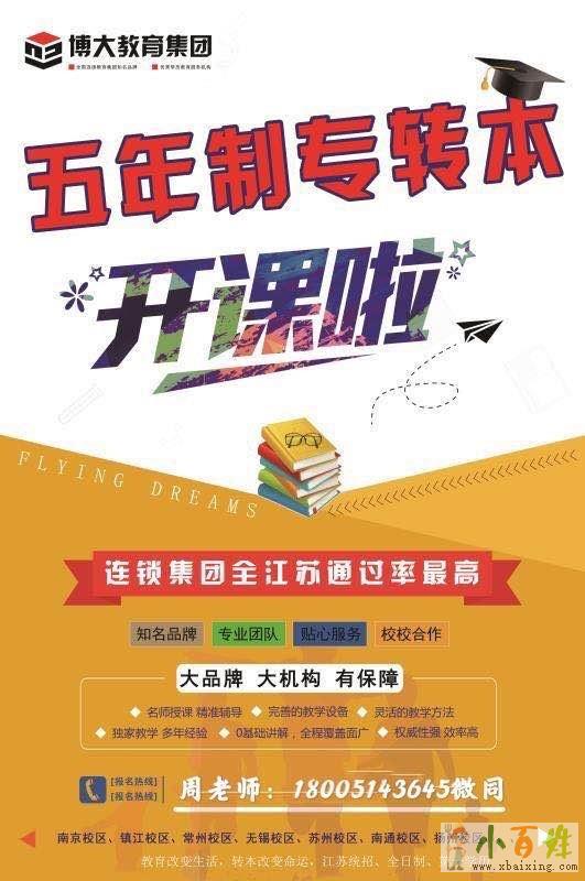 江苏瀚宣博大专转本主做五年制专转本(五年一贯制专转本)学.历教育行业十余年,历年来帮助数名考生成功转本,年年通过率稳居全省第1.这也是为什么家长和考生都极力推荐、极力选择我们江苏瀚宣博大的主要原因,我们用品牌说话,我们用通过率和升学率说话,拥有高通过率,学生和家长才自然而然也会帮我们去推荐更多的生源,这也是为什么我们江苏瀚宣博大能做这么大的原因所在小+百+姓+网。