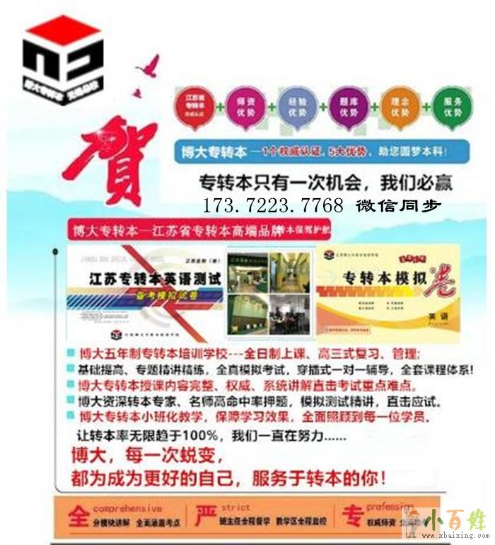江苏瀚宣博大专转本是江苏省唯1一家十多年来主做五年制专转本(五年一贯制专转本)的培训辅导机构,为江苏省所有高职生提供一个踏入本科院校拥有全日制本科第1学.历的平台小百姓网www.xbaixing.com。江苏瀚宣博大五年制专转本以提升学员基础为目的,做到让学生轻松学,高效学,从基础的知识点开始讲起,并通过课堂配套练习,让学员对知识的理解更加深刻,学习起来实用性更强,从而提高转本的通过率,以一流的师资,详细精准的内部学习资料,完善的学习方法,人性化的五年制专转本辅导服务,使历年转本通过率节节高升,部分专业甚至100%录取,2020年我校各城市录取通过率更是达到了81.5%,是江苏首个规模化、系统化、品牌化、小班化连锁机构,专业从事五年一贯制专转本培训学校小~百~姓~网。