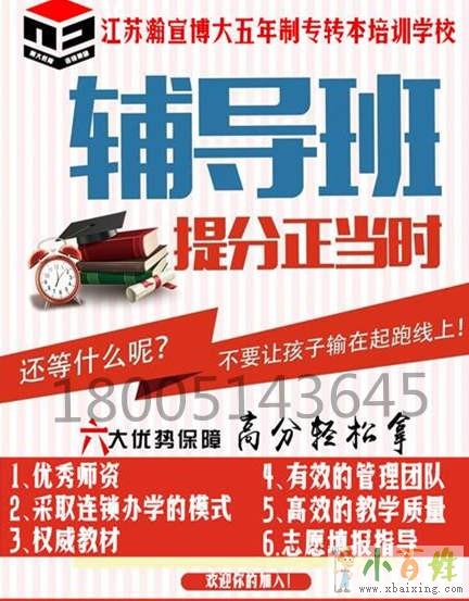 江苏瀚宣博大五年制专转本培训学校是五年一贯制高职家长考生都推荐,大品牌,连锁办学,通过率连续五年排名江苏省第1!采用连锁办学的模式,在江苏省南京、徐州、扬州、苏州、常州、无锡、镇江、南通等各城市均开设有校区,方便江苏省各个城市的五年一贯制高职专转本考生参加辅导和集训,并根据考生的不同基础情况提供五年制专转本考试政策的专业咨询、各大主考院校的详细介绍、统一报名、集体送考、通过率更高的志愿填报等一系列流程化服务,让考生对五年制专转本的了解更加深入,备考的针对性更强www.xbaixing.com。更多内容可以联系江苏瀚宣博大五年制专转本 武老师免费领取招生简章:180(微)0514(同)3645,fky186微。