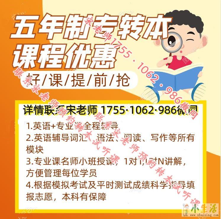 五年制专转本英语和两门专业课针对性培训辅导班到瀚宣博大,小班化授课,全日制上课模式,高考式复习管理,实行严格的上下课打卡制度,提高学员上课的积极性和主动性,现面向江苏省南京、徐州、扬州、苏州、常州、镇江、南通、无锡、盐城、泰州等各大城市五年一贯制高职院校想要转本考全日制本科的考生进行招生,不管你是英语基础薄弱或者专业课零基础,又甚至没有备考方向,不知道如何填报志愿的都可以来参加五年制专转本辅导,具体详情联系瀚宣博大宋老师1755(微)1062(信)986,联系老师预约转本试听课xbaixing.com。