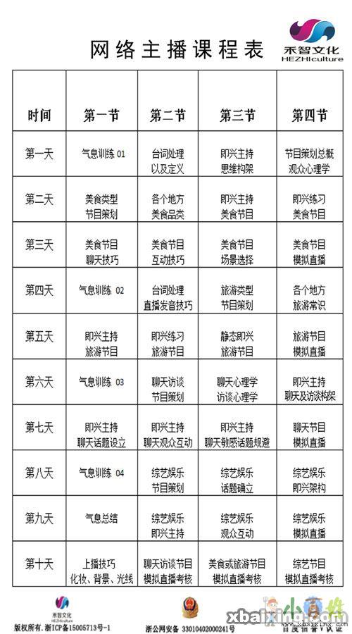 课程内容:声音塑造,即兴主持,节目策划,聊天技巧,美食旅游,聊天访谈,综艺娱乐,上播技巧,规避敏感话题等