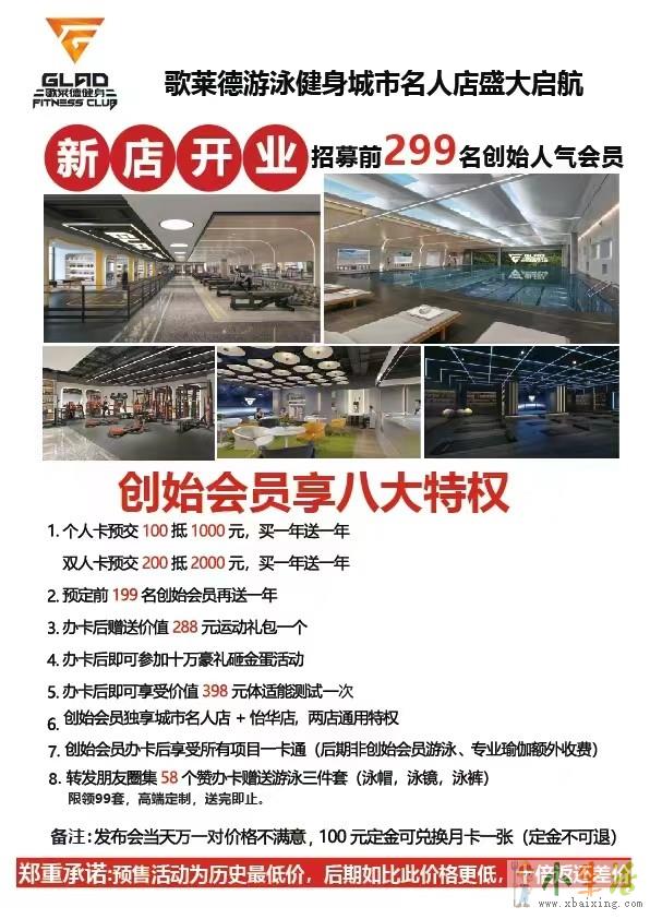 GLAD歌莱德游泳健身城市名人店盛大启航新店开业招募前299名创始人气会员创始会员享八大特权1个人卡预交100抵1000元,买一年送一年双人卡预交200抵2000元,买一年送一年2.预定前199名创始...