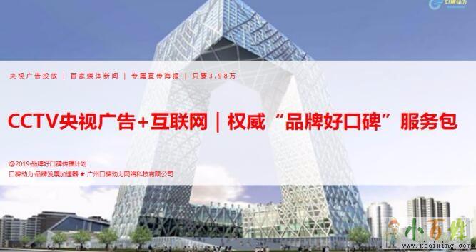 口碑动力专注于背书传播资源的整合,更加擅长传播效果的二次传播,我们为客户提供完善的推广解决方案来源www.xbaixing.com。我们不仅仅发布广告,更加有能力让央视广告等权威背书资源的影响力,在企业的营销渠道中落地,给企业招商与销售带来更多落地级持续作用。我们专注品牌背书类营销传播资源的整合应用,公司拥有CCTV央视广告、全国卫视地方台、纽约纳斯达克大屏、全国高铁站刷屏、二三线城市电梯海报、互联网口碑营销等广告传播资源。