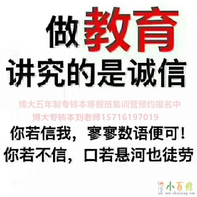 参加2020年五年制专转本考试的学生,如果觉得自己转本复习的学习策略匮乏、转本实力稍有薄弱的,选择瀚宣博大,瀚宣博大必会鼎力相助。想要了解更多关于瀚宣博大培训教育的资讯信息,可联系刘老师一五七一六一九七零一九 ,微同,添加微信免费预约试听课。学习是一条慢长而艰苦的道路,不能靠一时激情,也不是熬几天几夜就能学好的,必须养成平时努力学习的习惯小.百.姓.网。所以说:学习贵在坚持!