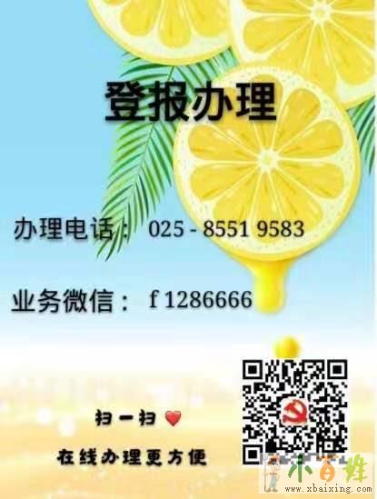 在线办理登报 今天办理,明天见报.登报声明,让您足不出户,就可登报,节约您宝贵时间.欢迎来电咨询电话025-85519583微信f1286666