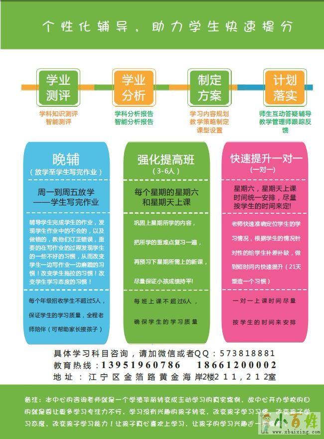晚辅 | 周一至周五 | 辅导学生完成学生的作业,发现学生作业中的不会的,以及做错的,教他们订正错误,重要的在写作业的过程发现学生的一些不好的习惯,从而改变学生一边写作业一边磨蹭的习惯!改变学生拖拉的习惯!改变学生学习态度的习惯! | 每个年级招收学生不超过5人,保证学生的学习质量,全程老师陪伴(可帮助家长接孩子) |