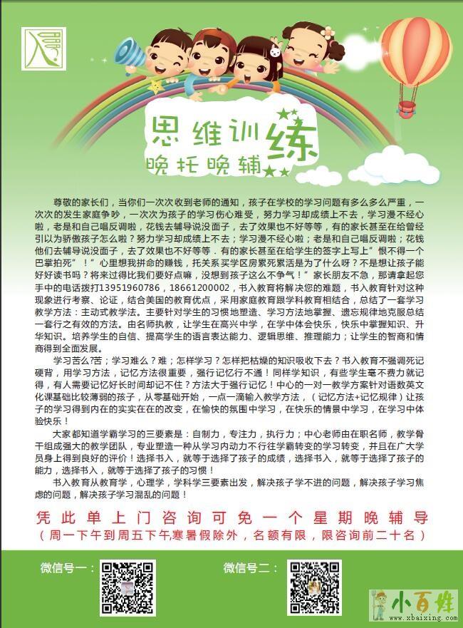 凭此单上门咨询可免一个星期晚辅导(周一下午到周五下午)(名额有限,限咨询前二十名)