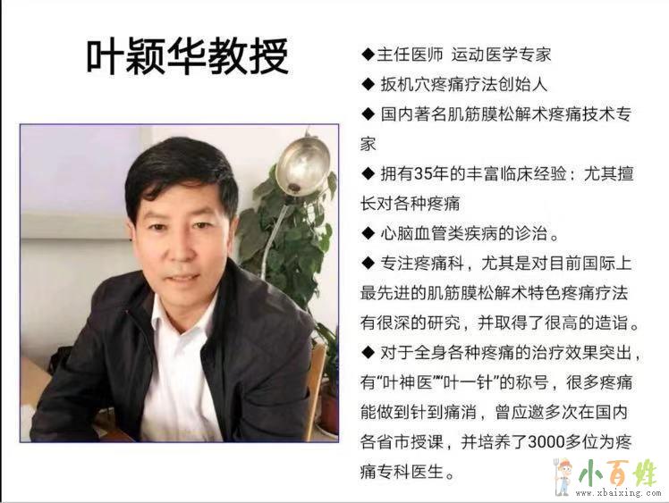 十、老师简介:叶颖华教授,同时从事中医、西医心脑血管研究30余年早期有幸接触肌筋膜疼痛专业,从此一心投入肌筋膜疼痛的研究中。国内外资料都有研习,后无以特拉维尔医生研究成果为主导,潜心深入研究,最终取得卓越成就在临床实践中,用肌筋膜松解术治疗疼痛收到了很好的效果。每年受益的疼痛患者数方人,几乎全部达到根除的效果。叶颖华教授意识到一人之力救人手水灭能力极有限,遂想到把肌筋膜松解术这一利人利己的专业广传全国,让更多人受益。几年来叶教授传播这一专业走遍祖国多个省份,各地区学生已达数千余人。为全国各地疼痛患者带去福音小 百 姓 网。所谓赠人玫瑰,手有余香,在传授这一治病救人技术同时,叶教授也受到全国客地学生和患者的一致好评和认可,广受赞誉。主任医师运动医学专家扳机穴疼痛疗法创始人国内著名肌筋膜松解术疼痛技术专家拥有35年的丰富临床经验:尤其擅长对各种疼痛.心脑血管类疾病的诊治。专注疼痛科,尤其是对目前国际上最先进的肌筋膜松解术特色疼痛疗法有很深的研究,并取得了很高的造诣。对于全身各种疼痛的治疗效果突出,有“叶神医“叶一针”的称号,很多疼痛能做到针到痛消,曾应邀多次在国内各省市授课,并培养了3000多位为疼痛专科医生。